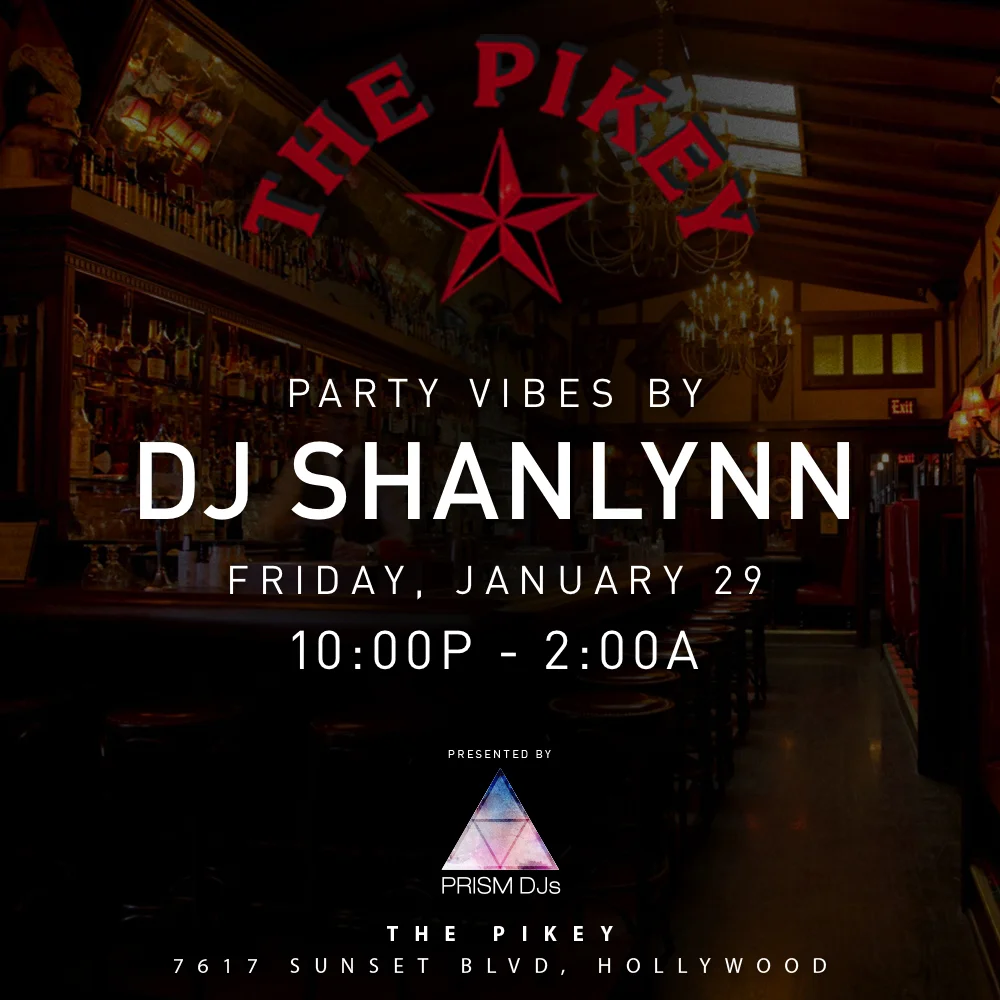 DJ ShanLynn | The Pikey Hollywood | January 29 Lounge & Club Jan 27 Written By PRISM Friday night, join DJ ShanLynn for all the party hits at The Pikey in Hollywood! djfemale djparty djlos angeles female djprism djsthe pikeyhollywoodhollywood djcorporate event djspecial event djlounge dj PRISM