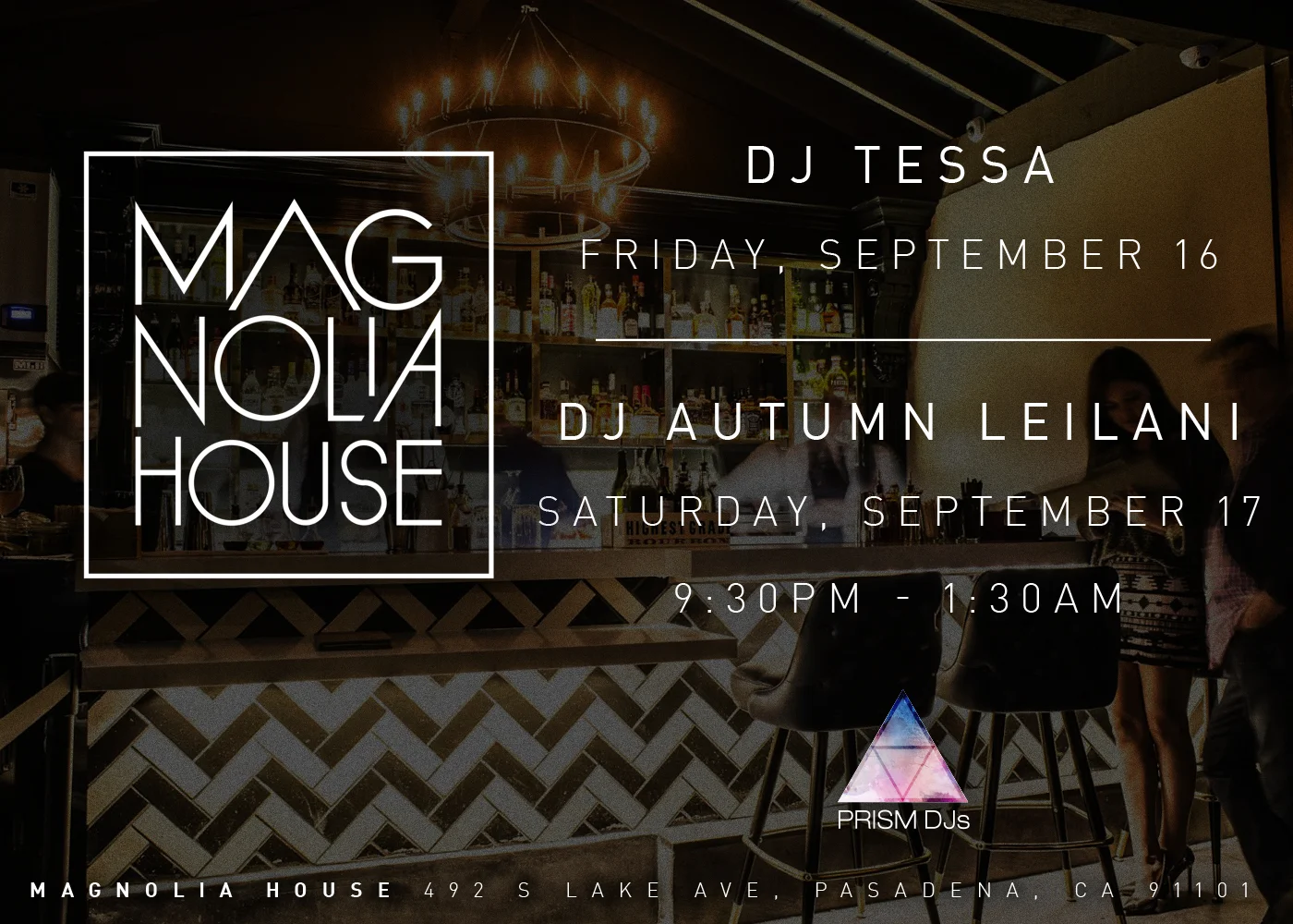 Catch Prism DJs this weekend at Magnolia House in Pasadena! DJ Tessa on Friday night and DJ Autumn Leilani on Saturday night from 9:30 p.m. to 1:30 a.m. Classic and current hits, pop, EDM, soul, funk, hip-hop!