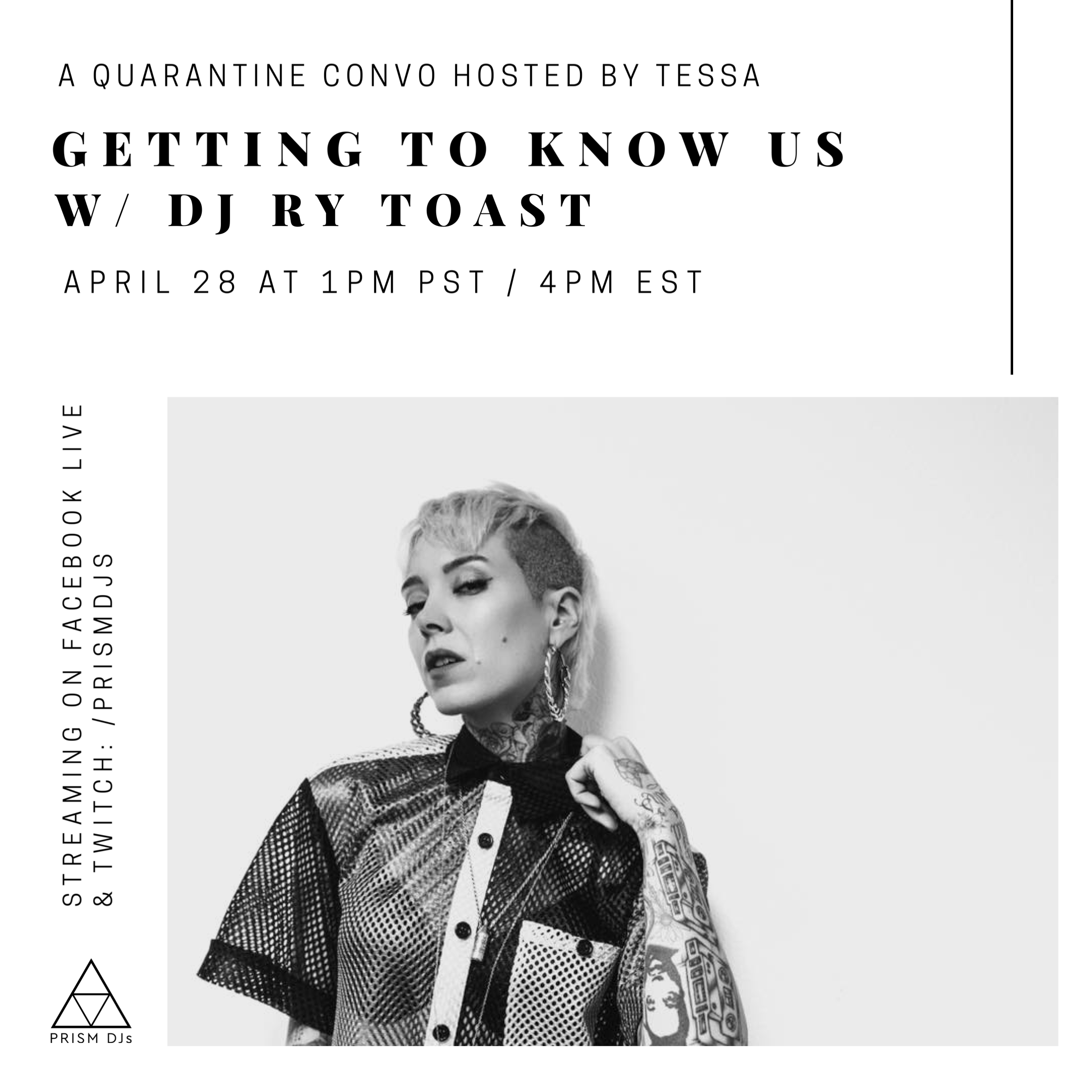 Tuesday, April 28th at 1pm PST/ 4pm EST, tune in for a chat with DJ Ry Toast to get to know more about her career, how she got started DJing, music interests, influences and more! Hosted by Tessa, Founder of Prism DJs. You can watch use on Prism DJs Facebook Live or Prism DJs Twitch pages!